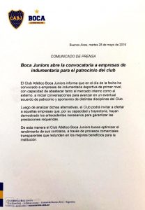 A través de un comunicado, el club confirmó que ya escucha a diferentes marcas que tengan la firme intención de vestir al Xeneize para a partir de 2020.