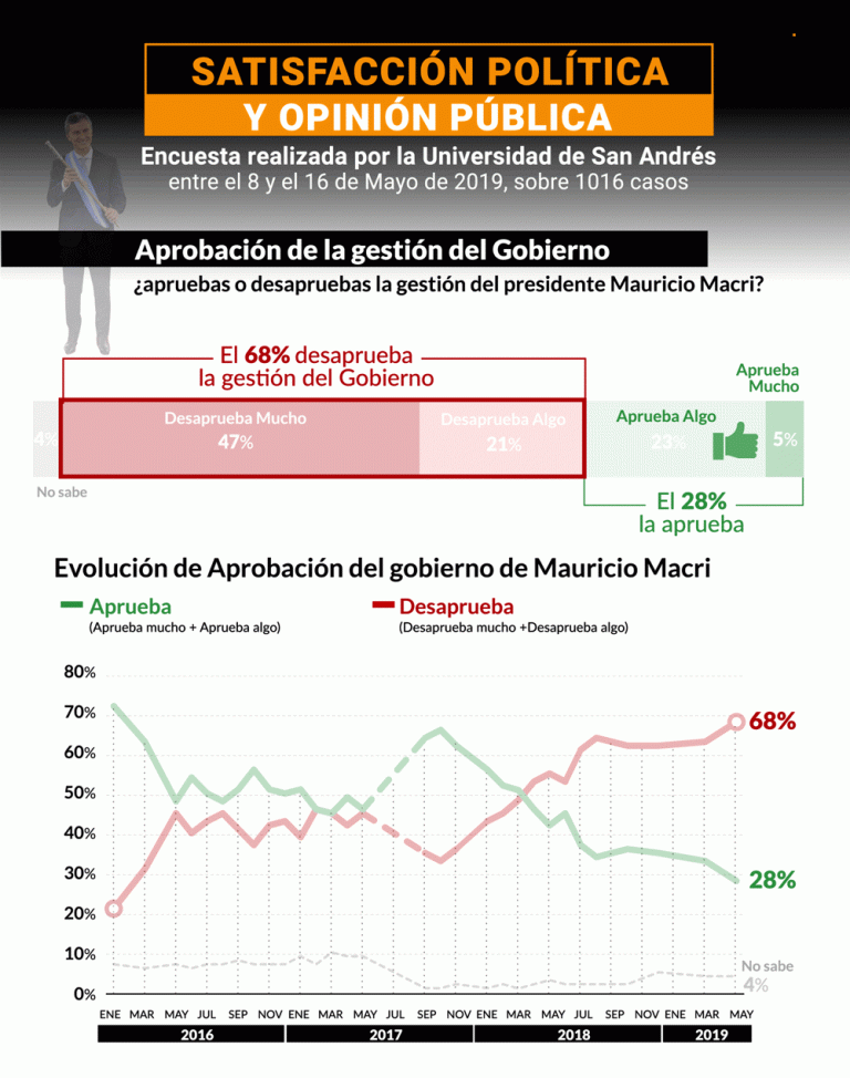 Un estudio que realiza de manera mensual la Universidad de San Andrés indagó, entre otros aspectos, sobre la satisfacción de la población con relación a la gestión de Cambiemos. En este sentido, y con relación al bimestre abril-mayo, el estudio revela una caída a los niveles más bajos de aprobación de la gestión del Ejecutivo (28%) y de satisfacción con la marcha general de las cosas (14%).