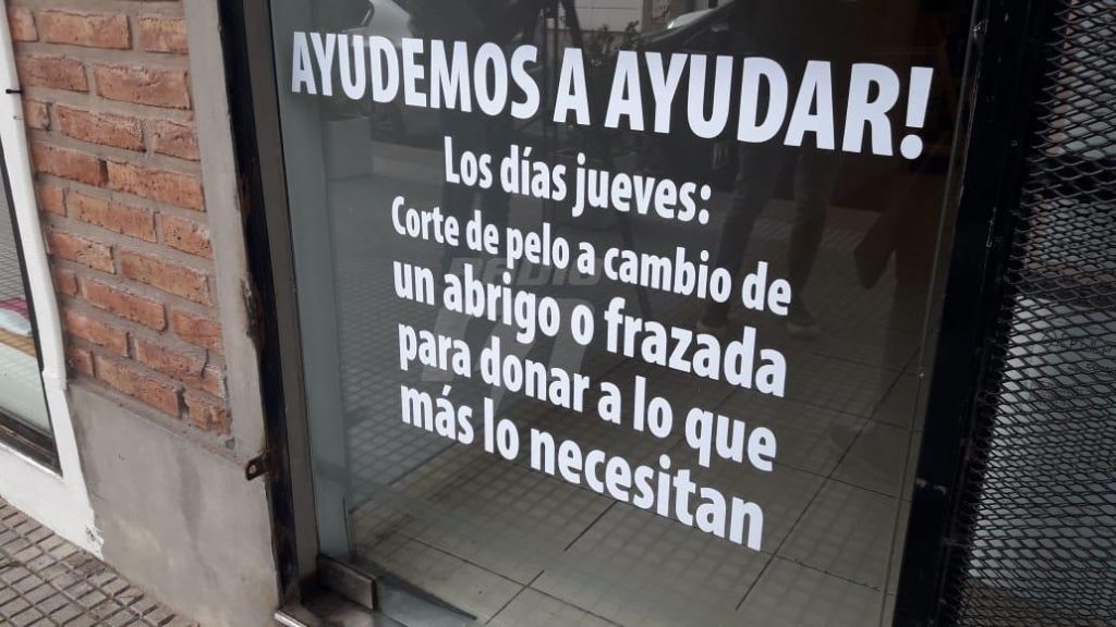 El cartel que aparece en el frente del local ubicado en La Rioja 3214 es claro: «Ayudemos a ayudar. Los días jueves: Corte de pelo a cambio de un abrigo o frazada para donar a los que más lo necesiten«.