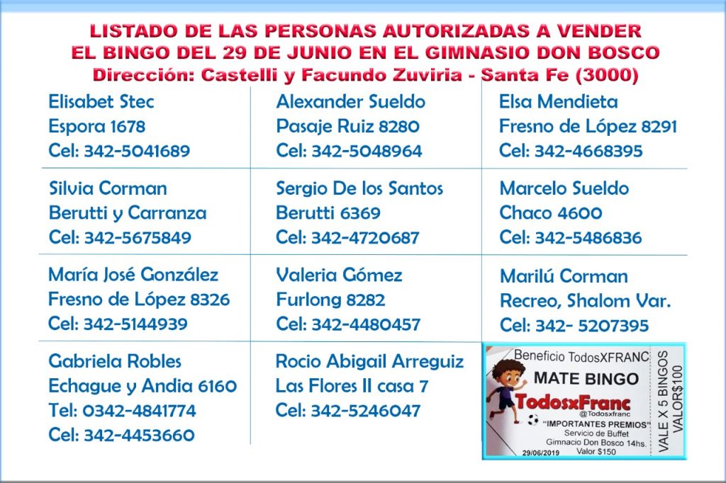 Marcelo Sueldo, primo del padre de Franciso, dijo que se necesita la colaboración «voluntaria y de corazón de todos los santafesinos». En esta ocasión se necesitan fajos de cartones de bingo de distintas series. «Son seis colores de cartones» aclaró Marcelo.