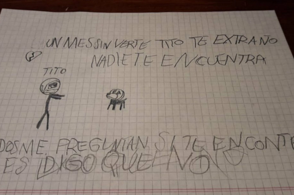 «Un mes sin verte, Tito, te extraño. Nadie te encuentra. Todos me preguntan si te encontré y les digo que no», escribió descorazonado Leo, de 11 años, en un dibujo donde se lo ve con su pequeño perro.