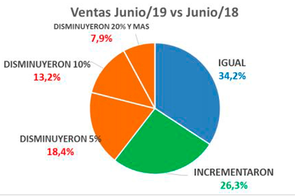 En relación a junio de 2018, el 26,3% de los comerciantes informó que aumentaron sus ventas, una respuesta que no se observaba desde hace tiempo. Además, un 34,2% declaró haber mantenido niveles similares de actividad y el 39,5% respondió haber vendido menos.