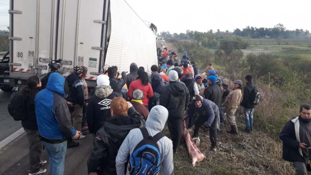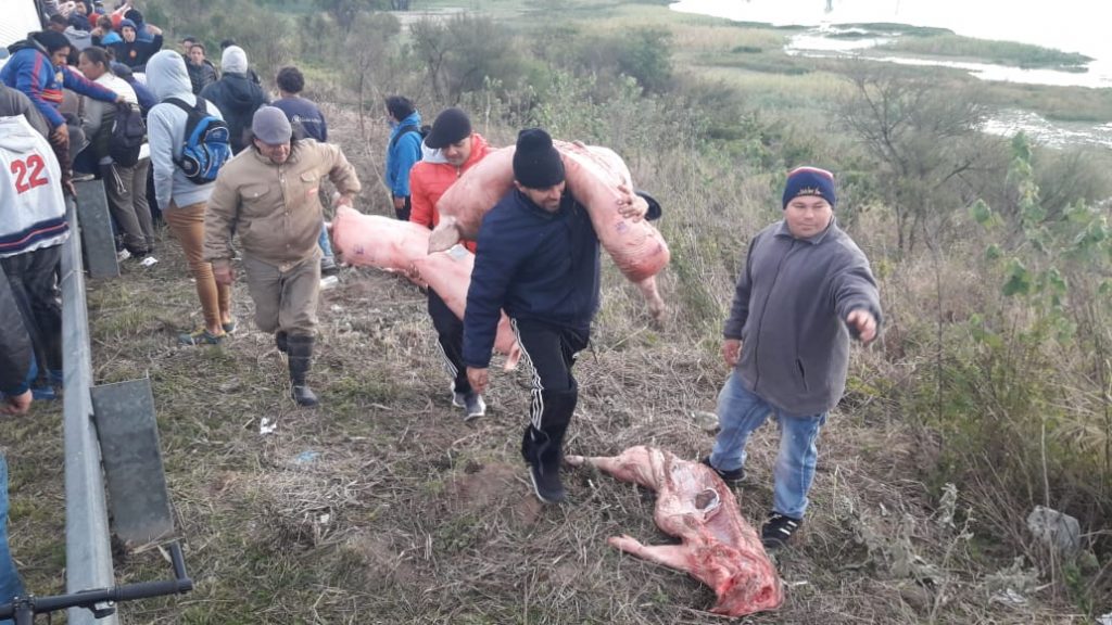 El conductor del camión dijo que llevaba casi 20 mil kilos de carne de cerdo. Además, manifestó que a los 5 minutos muchos vecinos de la zona se acercaron para llevarse las medias reses e, incluso, varios conductores frenaron en medio de la ruta y se llevaron la carne en los vehículos hasta que llegó la Policía Vial a custodiar el vehículo.