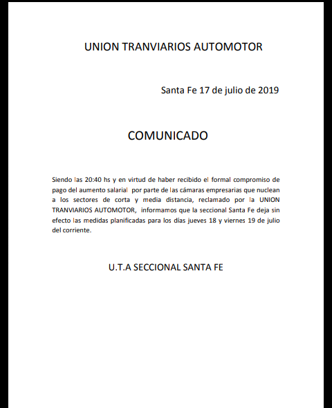 La UTA Santa Fe emitió un comunicado de último momento para informar que no ejecutarán el paro por 48 horas para este jueves y viernes.