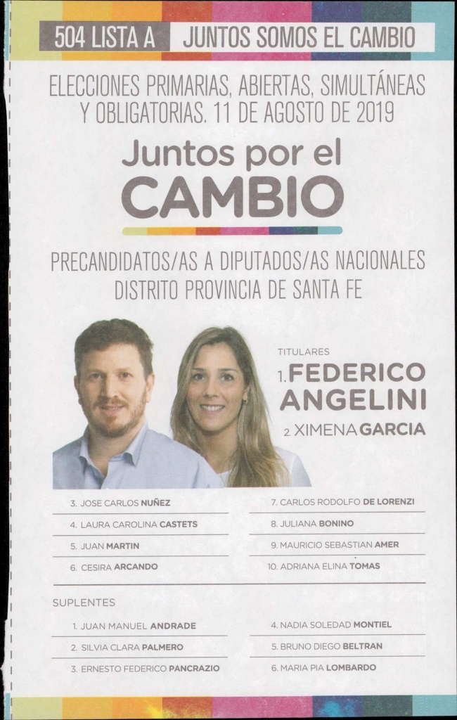 Alianza Juntos por el Cambio: con dos listas, (Juntos Somos el Cambio) encabezada por Federico Angelini, Ximena García, José Núñez, Laura Castest y Juan Martín. Por otro lado, (Vamos Juntos) encabezada por Martín Rosúa, María Paula Mascheroni y Walter Kreni. Son las listas que respaldan a la fórmula oficialista Macri- Pichetto.