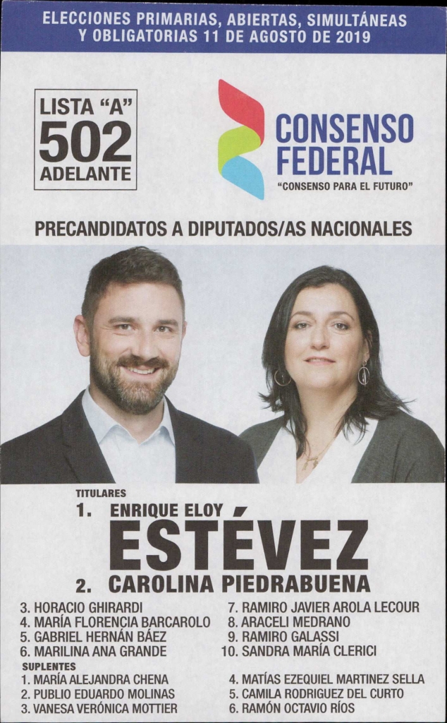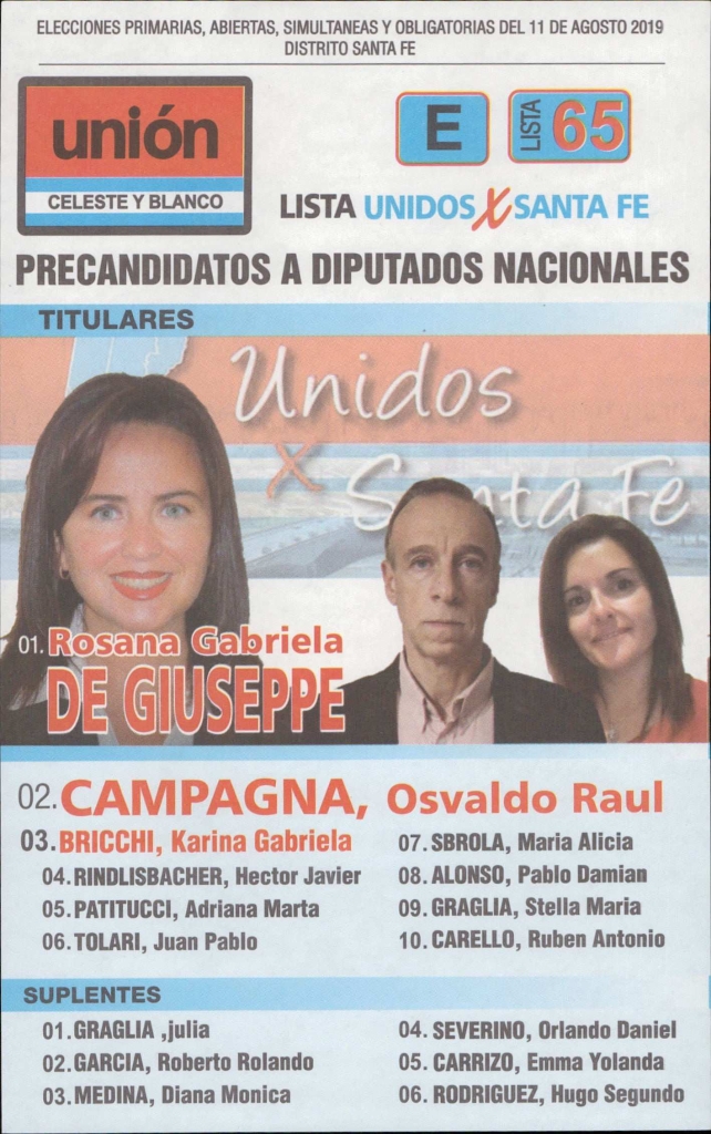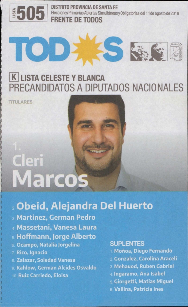 Alianza Frente de Todos: conformada por Marcos Cleri, Alejandra Obeid, Germán Martínez, Vanesa Massetani y Jorge Hoffmann están en la lista que respalda a Alberto Fernández y Cristina Fernández.