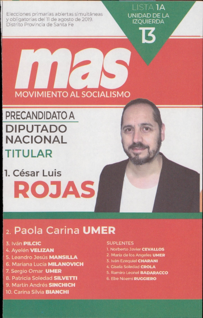 Movimiento al Socialismo: César Rojas encabeza la nómina que respalda a la candidata a presidenta de la Izquierda Manuela Castañeira y Eduardo Mulhall.