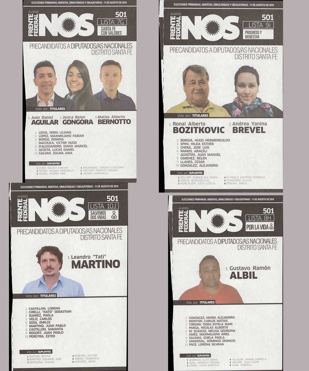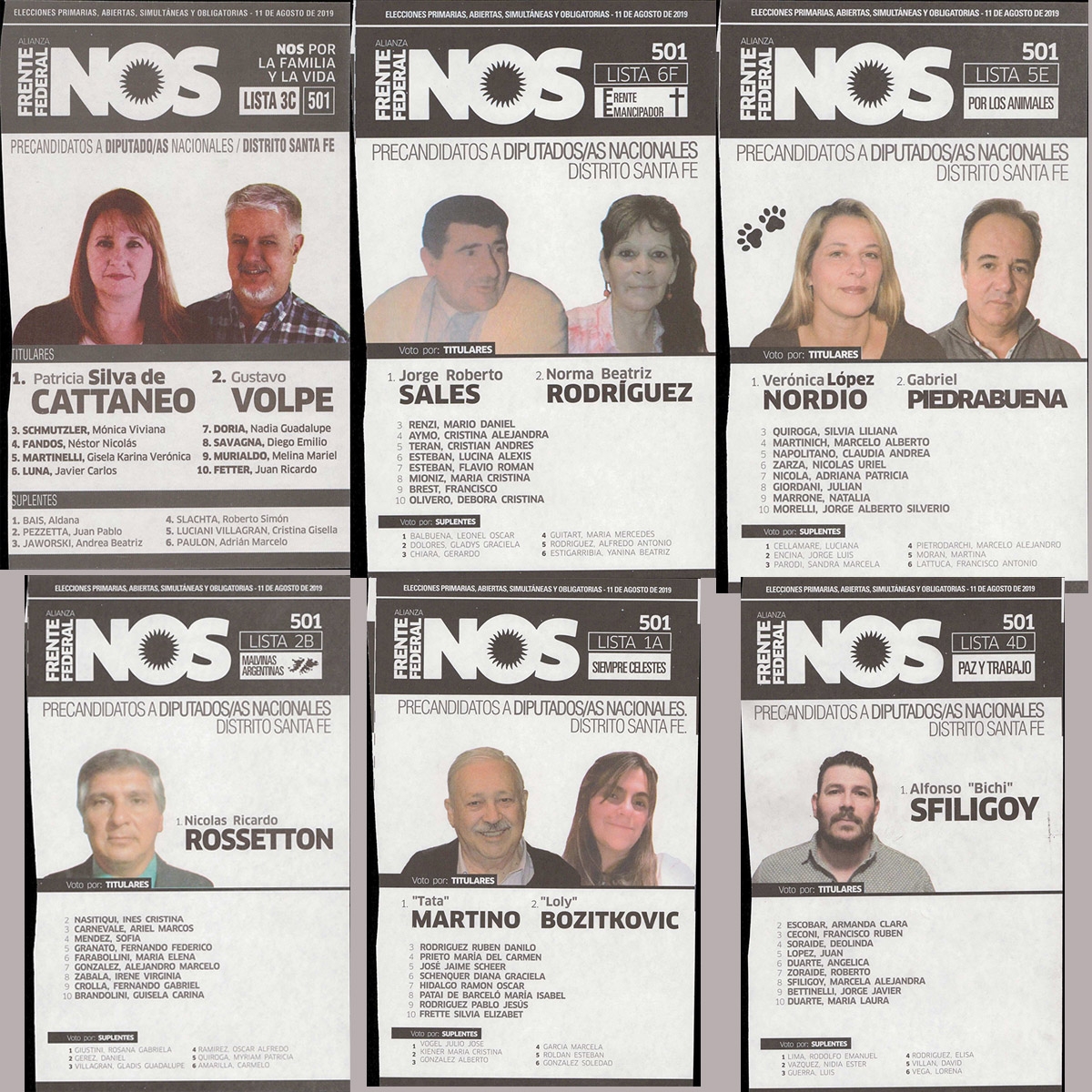 Alianza Frente Federal Nos: tiene 10 listas encabezadas por Jorge Sales, Nicolás Rossetón, Patricia Silva, Alfonso Sfiligoy, Gustavo Albil, Verónica López Nordio, Ronal Bazitkovic, Leandro Martino, Juan Daniel Aguilar.