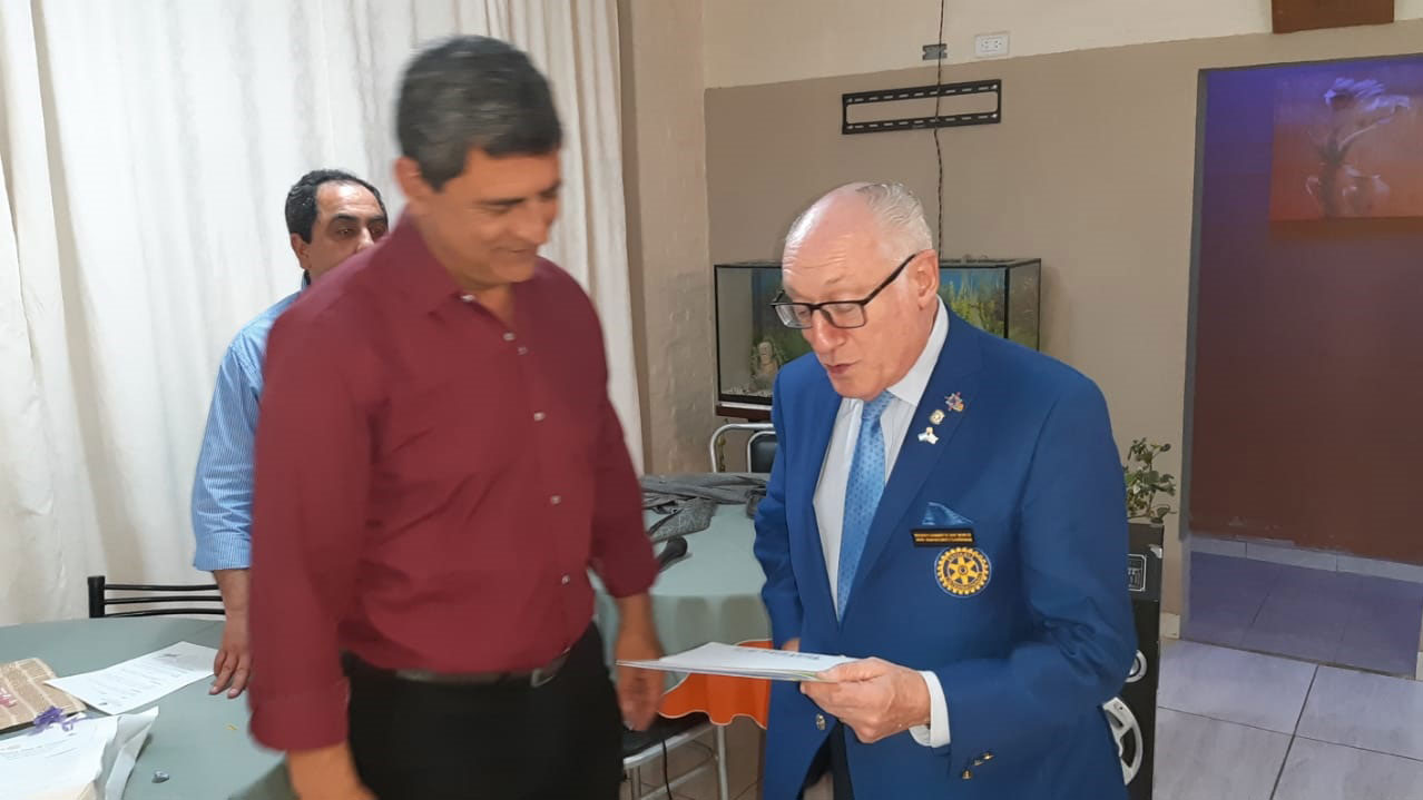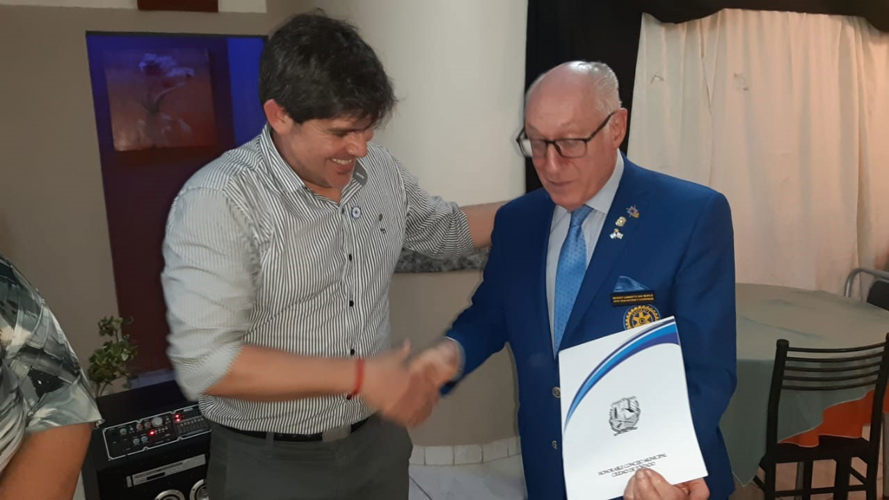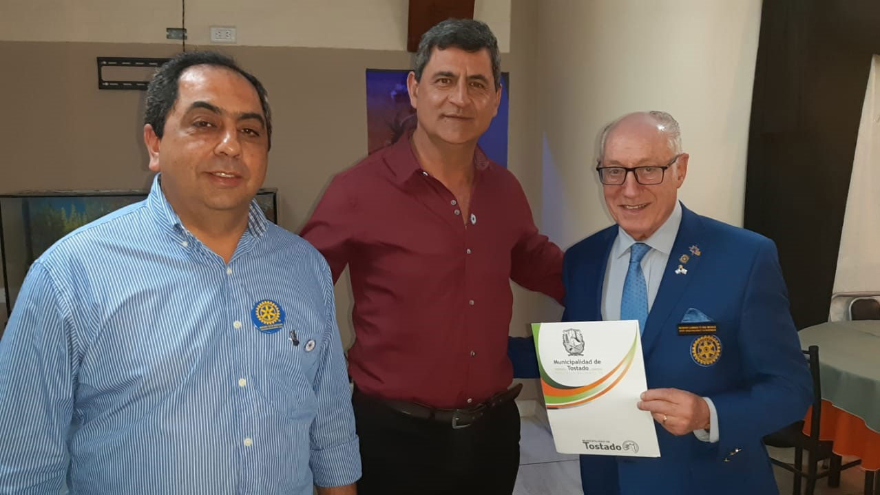 Estuvo presente también el intendente municipal Enrique Mualem, quien es a su vez socio honorario de Rotary Club Tostado. El mandatario entregó en manos del gobernador la resolución donde se lo declaraba Huésped de Honor durante su estadía. A su vez, el intendente recibió el pin con el lema rotario internacional para el periodo 2019-2020: “Rotary conecta al mundo”.