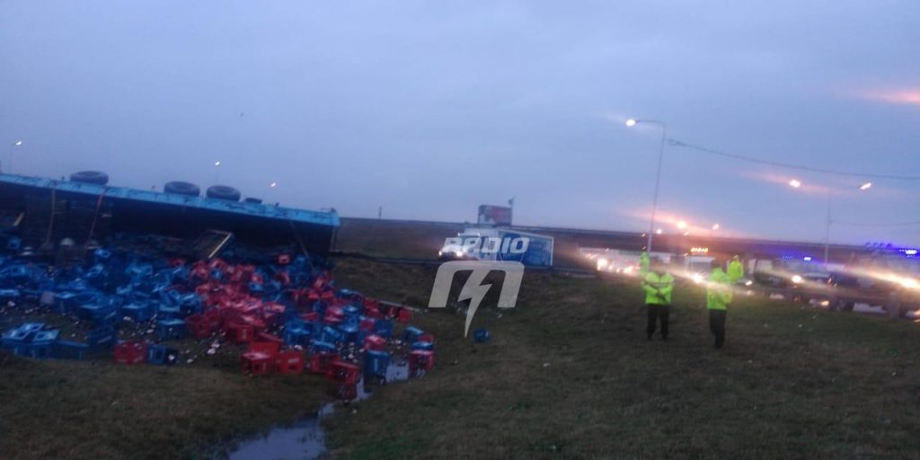 En la avenida Circunvalación sobre el rulo de ingreso a la autopista Rosario-Córdoba, Matías Mortigliengo perdió el control de la carga que derivó en un tumbo y la pérdida de la carga: cajones de cerveza.