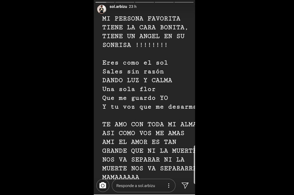 La joven escribió «eres como el sol, dando Luz y calma. Una sola flor que me guardo. Yo y tu voz que me desarma. Te amo con toda mi alma como vos me amás a mí. El amor es tan fuerte que ni la muerte nos va a separar Mamá».