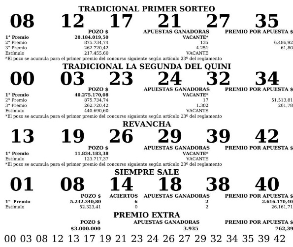 Los apostadores se quedaron con la categoría «Siempre sale» y cada uno se lleva $ 2.616.170,40. Así las cosas, para el próximo sorteo se espera un pozo acumulado estimado en $ 96.000.000.