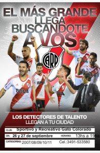 Este jueves 26 y viernes 27 de septiembre, el Club Sportivo y Recreativo Gato Colorado es escenario de una prueba de jugadores de fútbol infantil a cargo de representantes del Club Atlético River Plate.
