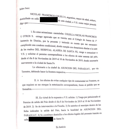 «Me presenté en Tribunales y luego de ver todos los legajos y ver las partes que se encuentran divididas, encuentro un pedido donde el señor Colella, condenado por estrago culposo, solicita autorización para ausentarse en el país el día 8 de noviembre de 2019 para ir a Paraguay vía terrrestre«, expresó el abogado Baridon. «Me comuniqué con mi representada, María José Lacorte, y me manifiesta que se opone a esto, es una falta de respeto a las victimas pedir una autirización para salir del país«, continuó.