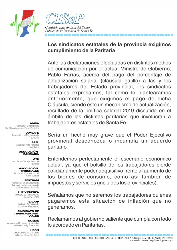 Luego de la frase del ministro de Gobierno, Pablo Farías, en la cual pone en duda el pago de la cláusula gatillo en Noviembre, la Comisión Intersindical del Sector Público de la Provincia de Santa Fe exigió en un comunicado que se respeten los acuerdos paritarios.