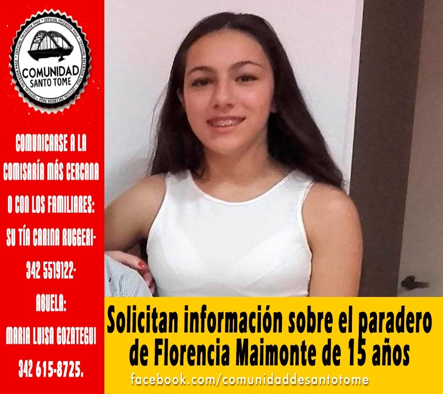 Solicitan información sobre el paradero de Florencia Maimonte de 15 años. Se ausentó de su domicilio en horas de la mañana del día de lunes 21 de octubre. Familiares realizaron la denuncia en la Comisaria 12 de Santo Tomé.