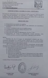 El Consejo de Administración de la Escuela de la Familia Agrícola (EFA) N° 8205 de Colonia El Inca, convoca nuevamente a sus asociados a la Asamblea General Ordinaria a realizarse el día 22 de noviembre de 2019 a partir de las 18:00 Hs. en su sede, sito en Colonia El Inca, Tostado, Santa Fe, para tratar el siguiente: