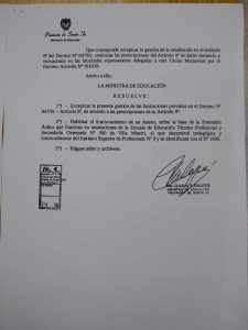 La Ministra de Educación de Santa Fe, Claudia Balagué, firmó este jueves 31 de octubre la Resolución N° 1696 a través de la cual habilita el Anexo Villa Minetti del Instituto Superior de Profesorado N° 9. Lo hizo luego de la reciente carta pública dada a conocer desde la institución, desde donde se manifestó preocupación por la situación agravada por promesas incumplidas; y que se organizara desde Amsafe 9 de Julio un abrazo solidario al edificio.