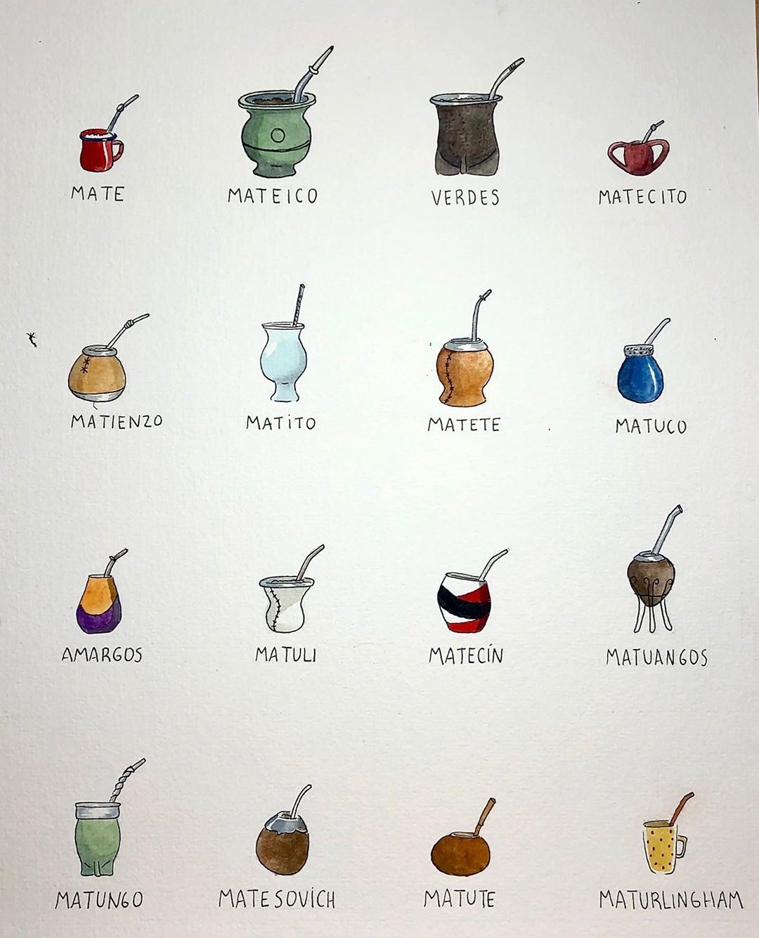 «Diez y seis formas de llamar al mate» así llamó una artista a su obra de arte que se viralizó. La imagen contiene 16 figuras distintas -en cuanto al tamaño y diseño- de la famosa bebida a base de yerba que prefieren los argentinos y uruguayos y cada una lleva debajo una palabra -seguramente no aprobada por la RAE- con la que se lo identifica.