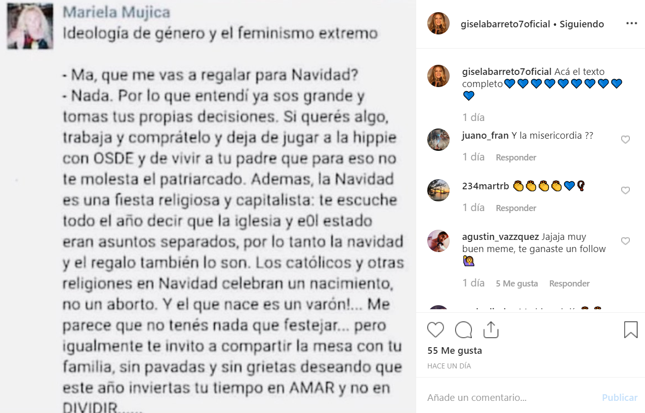 Quizás ante la posibilidad de cambios que son contrarios a sus creencias, el texto que aparece como si hubiese sido publicado por el usuario Mariana Mujica, comenzó a viralizarse en redes sociales y en Whatsapp, especialmente entre quienes defienden “Las dos Vidas”. Una de ella fue Gisela Barreto, quien siempre se mostró a favor de los pañuelos celestes.