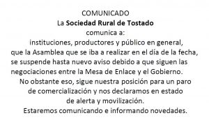 La Sociedad Rural de Tostado (SRT) dio a conocer la suspensión de la asamblea que estaba programada para este jueves, pero aclaró que mantiene su posición respecto a las recientes medidas nacionales que inciden en el sector y se encuentra “en estado de alerta y movilización”.