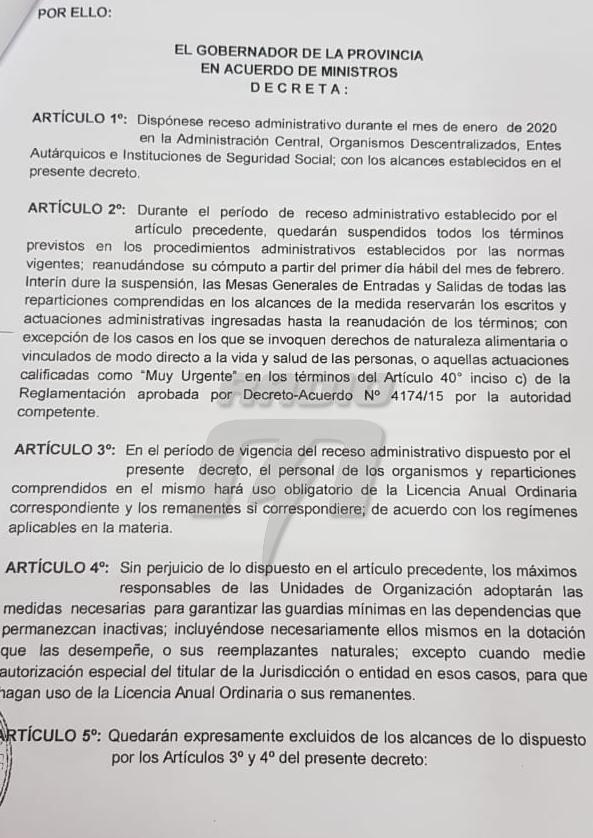 Según el artículo 2 del decreto, durante enero quedarán suspendidos «todos los términos previstos en los procedimientos administrativos establecidos por las normas vigentes». La licencia que será obligatoria para todo el personal público será a cuenta de «la Licencia Anual Ordinaria y sus remanentes correspondientes».