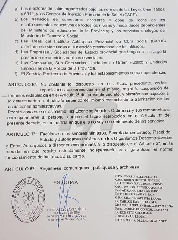 La medida, que todavía no fue justificada, destaca que se mantendrán guardias mínimas en las mesas de entrada y salida para darle curso a los trámites «muy urgentes». En tanto, la Policía, los hospitales públicos, los centros de salud, el Servicio Penitenciario, IAPOS y los merenderos de Copa de Leche no se verán afectados por el decreto.