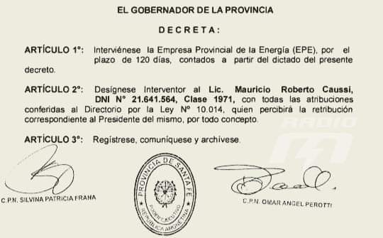 La medida fue adoptada a través de un decreto del flamante mandatario, que consta de tres artículos. En el segundo de ellos se designa interventor a Mauricio Roberto Caussi, quien ya había sido anunciado para ocupar la titularidad de la EPE durante la presentación del nuevo Gabinete. Caussi, dice el texto, «tendrá todas las atribuciones conferidas al directorio».