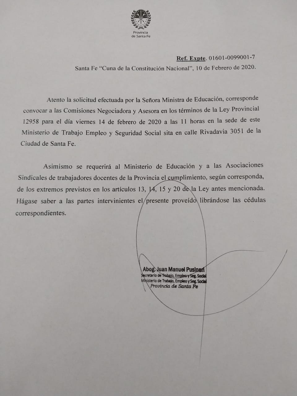 Con la firma del secretario de Trabajo de la Provincia, Juan Manuel Pusineri, se convocó a las partes que conforman la mesa paritaria docente para el próximo viernes 14 de Febrero.