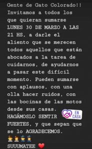 La convocatoria surgió a través de las redes sociales con el siguiente mensaje: “Gente de Gato Colorado. Invitamos a todos los que quieran sumarse. Lunes 30 de marzo a las 21 Hs. a darle el aliento que se merecen todos aquellos que están abocados a la tarea de cuidarnos, de ayudarnos a pasar este difícil momento. Pueden sumarse con aplausos, con una olla hacer ruidos, con las bocinas de las motos, desde sus casas. Hagámoslo sentir fuertes, y que sepan que se lo agradecemos”.