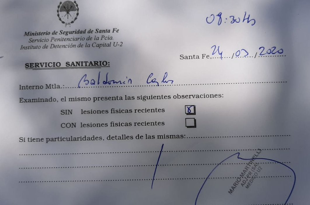 Evidentemente, el canal TN se hizo eco de las cadenas de WhatsApp que tanto circulan por estos días con información falsa. Baldomir se encuentra en buen estado de salud dentro de la unidad penitenciaria, como esta imagen y el certificado médico lo demuestran.