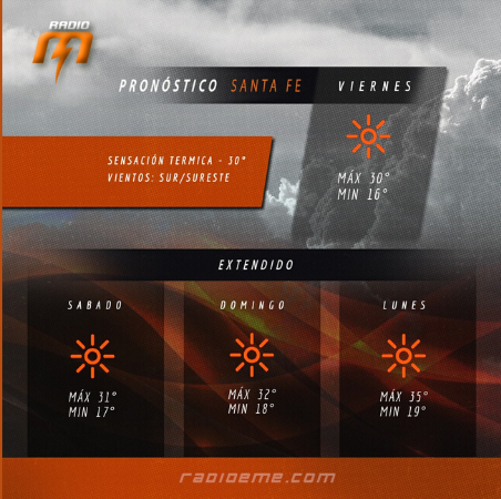 Viernes: mínima 16° – máxima 30°. Cielo despejado o con leve nubosidad. Condiciones estables. Temperaturas con poco cambio. Vientos leves predominando del sector sur/sureste, rotando nor/noreste.