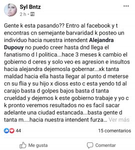 Fuerte repudio al posteo de una persona que denigró y maltrató a la Intendente Alejandra Dupouy. Lo hizo atreves de la Red Social Facebook y causó reacción negativa en la comunidad.
