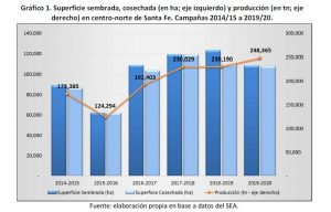 En el siguiente gráfico se presenta la superficie sembrada y cosechada, y los volúmenes producidos en los doce departamentos del centro-norte de Santa Fe desde la campaña 2014/15.
