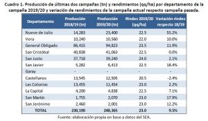 En cuanto a la distribución geográfica dentro del territorio que contempla el SEA, se detecta que el principal aumento en la producción provino de los departamentos del norte provincial, principalmente 9 de Julio y General Obligado, donde la campaña pasada se habían observado importantes consecuencias negativas por excesos hídricos.
