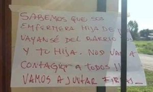 La profesional de la salud recibió un cartel con una leyenda amenazante en la puerta de su hogar. Este domingo por la mañana, una enfermera de la cuidad de Santo Tome se encontró con un mensaje desagradable y repudiable, en el portón de su domicilio. El cartel manifiesta en su leyenda: «Sabemos que sos enfermera … Sigue leyendo Indignación: una enfermera fue amenazada por sus vecinos en Santo Tomé