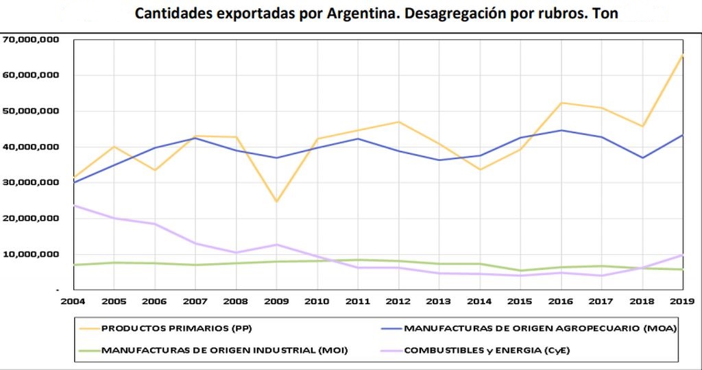 Al estudiar la performance exportadora entre 2004 y 2019, el trabajo destaca que se generó una caída de valor desde casi 84.000 millones de dólares exportados en 2011 hasta 65.000 millones el año pasado, a pesar de que los volúmenes crecieron de 100 a 130 millones de toneladas. Este resultado se explica en un derrumbe de las ventas de combustible y energía, en contraposición a un salto en la participación de productos primarios pero a precios mucho más bajos.