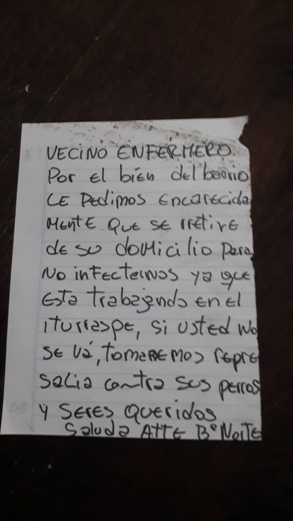 El mensaje afirma lo siguiente: «Vecino enfermero: por el bien del barrio, le pedimos encarecidamente que se retire de su domicilio para no infectarnos, ya que esta trabajando en el Hospital Iturraspe. Si usted no se va, tomaremos represalias con sus perros y seres queridos. Saluda atentamente Barrio Norte».