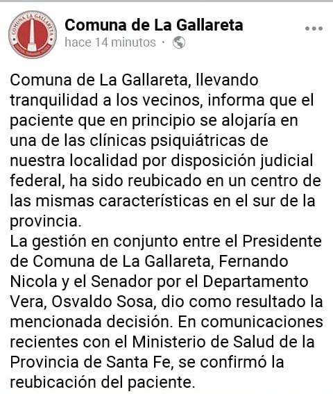 Ante la preocupación que había generado entre los vecinos de aquella localidad, el presidente comunal de La Gallareta, Fernando Nicola, junto al senador departamental, Osvaldo Sosa, presentaron recursos legales para rechazar su internación.