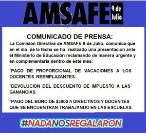 La comisión directiva de Amsafe 9 de Julio dio a conocer que este lunes desde el gremio se realizó “una presentación ante el Ministerio de Educación reclamando de manera urgente y en complementaria dentro de este mes” tres puntos concretos.