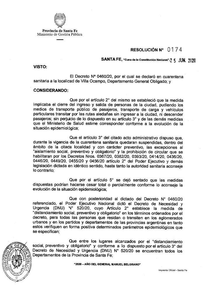 En consecuencia, una localidad del norte provincial fue favorecida. La misma se trata de la ciudad de Villa Ocampo, en el Departamento General Obligado. Tras haber retrocedido de fase a causa del brote de Coronavirus que había sufrido la localidad, el ejecutivo provincial le permitió regresar a la «fase 5» de la Cuarentena luego de controlar la epidemia.