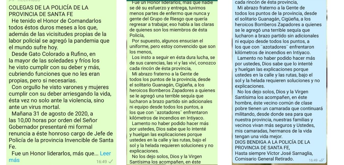 Con un extenso mensaje de WhatsApp dirigido a sus “colegas de la policía de la provincia de Santa Fe”, el comisario anunció su retiro. “He tenido el honor de comandarlos en todos estos duros meses”, aseguró.