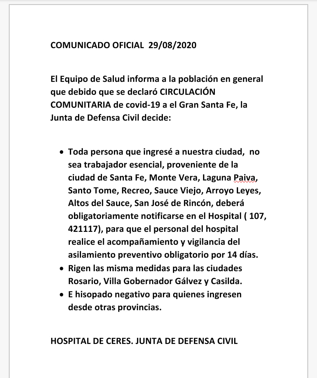 Ceres Actualizado: lunes 31 de agosto de 2020 Nuevas disposiciones para ingresar a Ceres lunes 31 de agosto de 2020 Compartir FacebookTwitterWhatsAppEmailTelegram Además Santa Fejueves 4 de diciembre de 2025El Concejo Municipal debate las reformas en la Caja de Jubilaciones Nacionalesjueves 4 de diciembre de 2025Las Provincias recibieron $5,48 billones en octubre Economíajueves 4 de diciembre de 2025Santa Fe emite deuda para captar fondos destinados a la obra pública La Junta de Defensa Civil y el equipo de salud del Hospital Regional de Ceres decidieron registrar a personas que ingresen de lugares de circulación comunitaria para hacerles un seguimiento. Seguí todas las noticias de RadioEME.com en Google News EtiquetasCerescoviddisposiciones Compartir FacebookTwitterWhatsAppEmailTelegram Artículo anteriorEl Sitram de Ceres realiza refacciones en los sanitarios de la Sede SocialArtículo siguienteCovid-19: Confirman 2 casos positivos en Colonia Alpina Últimas noticias Santa Fejueves 4 de diciembre de 2025El Concejo Municipal debate las reformas en la Caja de JubilacionesEste jueves, el Concejo Municipal de Santa Fe pondrá a consideración el Mensaje 41/25 del Departamento Ejecutivo, que propone... Nacionales Las Provincias recibieron $5,48 billones en octubre jueves 4 de diciembre de 2025 Economía Santa Fe emite deuda para captar fondos destinados a la obra pública jueves 4 de diciembre de 2025 Colón Inhibición, deuda y mánager: las prioridades de Alonso en Colón jueves 4 de diciembre de 2025 Provinciales Provincias Unidas: el nuevo espacio de 22 diputados que será la tercera fuerza y estará presidido por Scaglia jueves 4 de diciembre de 2025 Artículos relacionados Ceres: incautaron más de 100 kilos de cocaína ocultos en un auto durante un control en Ruta 34 Ceres martes 2 de diciembre de 2025 Liga Ceresina: Unión de San Guillermo es el campeón del Clausura Ceres martes 2 de diciembre de 2025 Ceres: la familia de Jairo denuncia posible adulteración de la historia clínica y pide intervención judicial Ceres sábado 2 de agosto de 2025 Ceres: la Provincia licitó la construcción del nuevo edificio del Instituto Superior Nº 26 Ceres martes 22 de julio de 2025