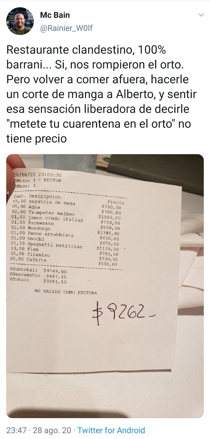 «Restaurante clandestino, 100% barrani… Si, nos rompieron el orto. Pero volver a comer afuera, hacerle un corte de manga a Alberto, y sentir esa sensación liberadora de decirle «metete tu cuarentena en el orto» no tiene precio», escribió el usuario @Rainier_W0lf en Twitter, en un intento de acto heroico para ir contra las medidas del Gobierno que buscan frenar el aumento de contagios de COVID-19.