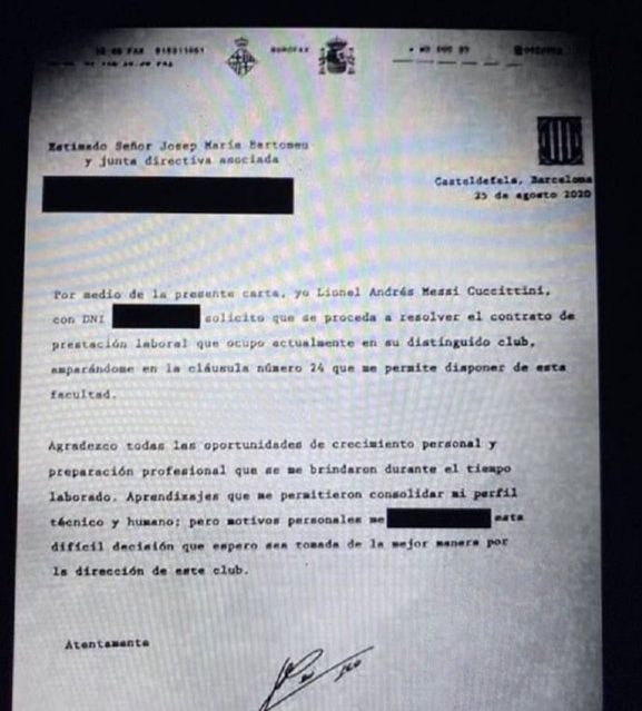 A horas de la noticia, se publicó una imagen del documento que Messi envió al club. “Solicito que se proceda a resolver el contrato de prestación laboral que ocupo actualmente en su distinguido club, amparándose en la cláusula numero 24 que se me permite disponer de esta facultad”, señala el burofax que está firmado por el rosarino de 33 años.