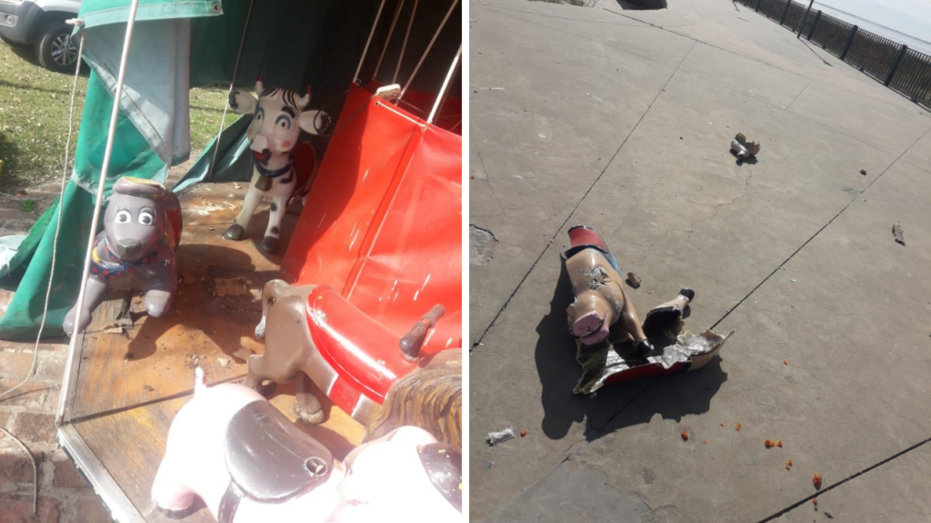 En horas de la mañana, vecinos de la zona alertaron a los dueños del lugar, donde la clásica calesita y su trencito que tanto divierten a los niños sufrieron daños materiales. Además, parte de los animales plásticos que animan a cada parada de las atracciones se encontraron en las inmediaciones del espigón de la costanera completamente destruidos.