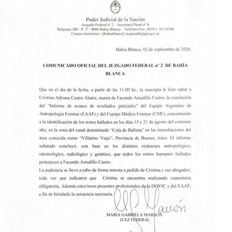 “Las querellas de Cristina Castro informan que tras la audiencia realizada de manera remota esta mañana, la jueza federal María Gabriela Marrón confirmó que, según el cotejo de ADN realizado por el Equipo Argentino de Antropología Forense, los restos encontrados el 15 de agosto en un cangrejal en la zona de Villarino Viejo corresponden con la identidad de Facundo Astudillo Castro, el joven que estuvo desaparecido desde el 30 de abril”, informó la CPM.