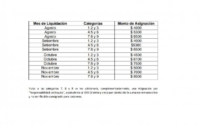 La misma suma será con los sueldos de septiembre. Luego, en octubre se abonarán 4.500 pesos para las categorías de los niveles inferiores y en noviembre serán 5.000 pesos (hasta 11.000 pesos para las categorías más altas).