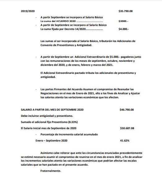 El convenio acordado conjuntamente con las tres cámaras empresariales del sector (CAME, CAC y Udeca) establece un pago extraordinario de $35.000, de carácter no remunerativo y de naturaleza excepcional, que se abonará en siete cuotas mensuales y consecutivas de $5.000 cada una, desde de septiembre, octubre, noviembre, diciembre, enero, febrero y marzo de 2021.