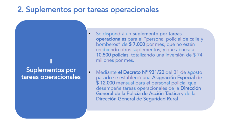 Lo que dispone el gobernador Omar Perotti es un suplemento por tareas operacionales para el personal policial de calle y bomberos de 7 mil pesos mensuales, que beneficiará a quienes no estén recibiendo otros adicionales. La suma a percibir abarca a 10.500 policías, totalizando una inversión de 74 millones por mes de pesos por mes.